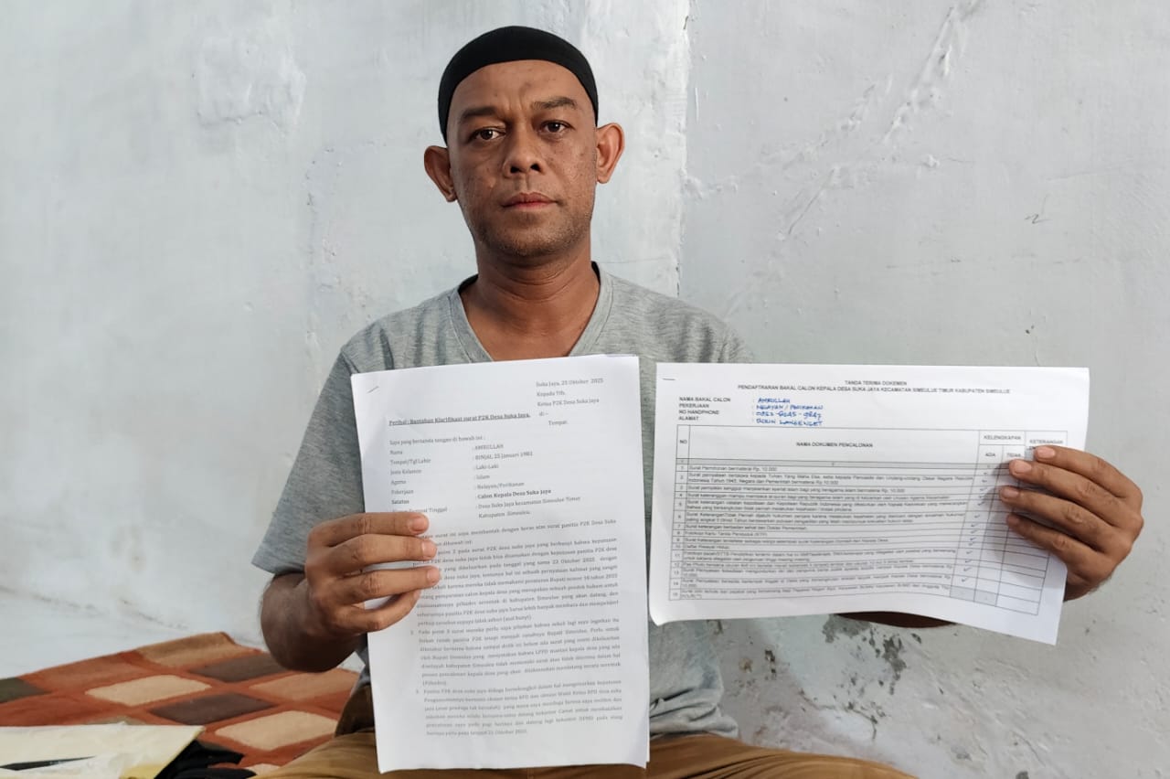 ‎”Panitia melampui kewenanganya dalam menetapkan Calon Kepala Desa Suka Jaya. Saya meminta Bupati Simeulue agar mengevaluasi panitia. Saya menduga ada dugaan persengkongkolan. Sehingga saya tidak diloloskan. Kemungkinan saya akan tempuh jalur hukum. Jika panitia tidak merubah keputusannya,”kata Amrullah saat melakukan konferensi pers di kediaman nya. Minggu, (26/10/2025).