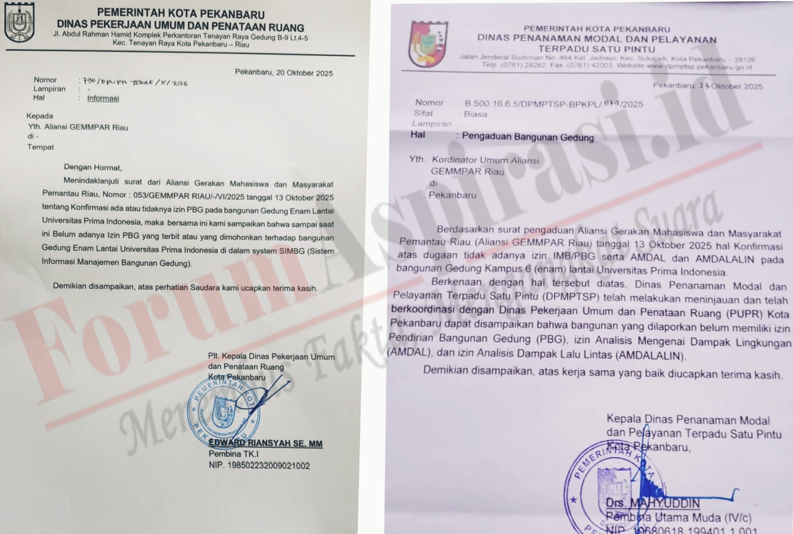 Dugaan ini tidak lagi sekadar isu karena dua surat resmi dari dinas teknis Pemko Pekanbaru justru memperjelas bahwa gedung kampus tersebut tidak memiliki izin dasar untuk berdiri maupun beroperasi.