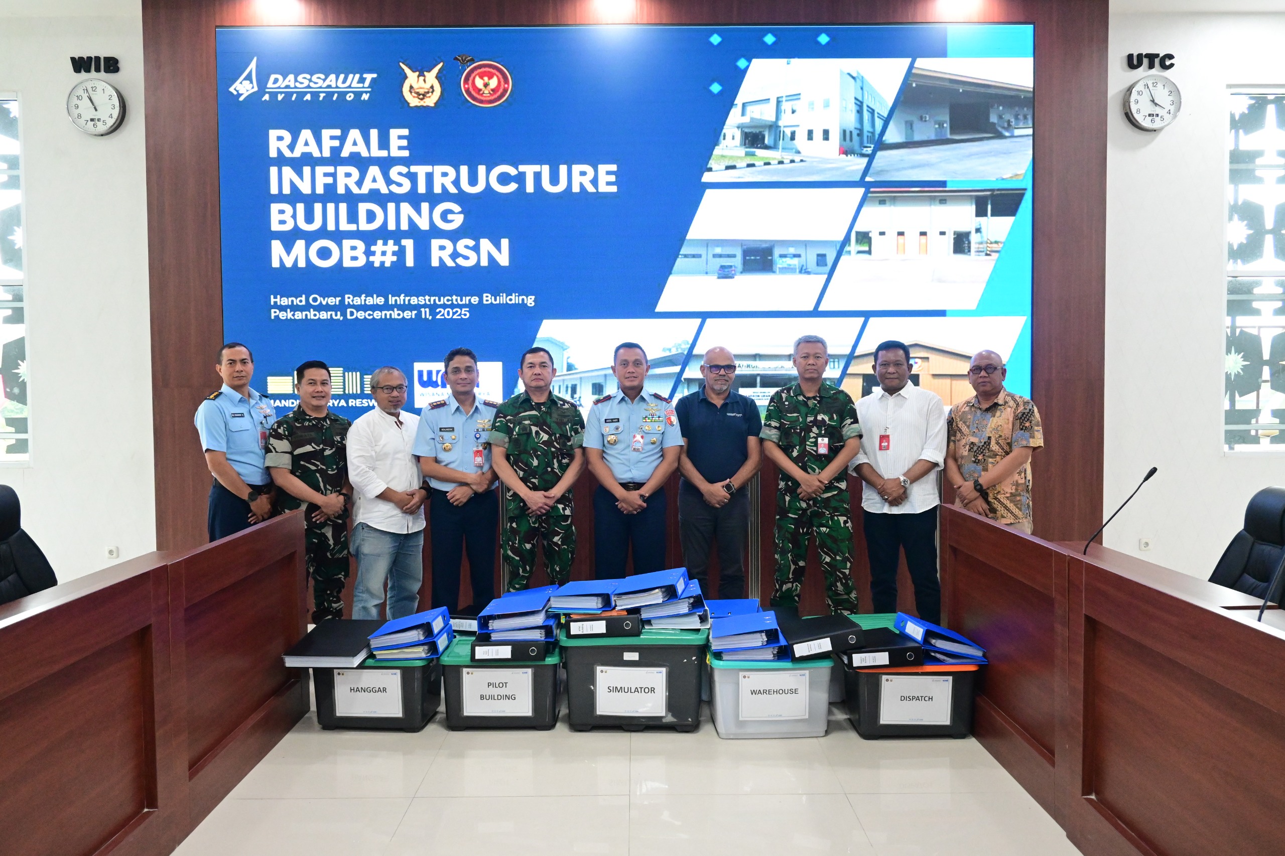 Penyerahan tersebut dilakukan oleh Rafale & Falcon Program Management Representative in Indonesia, Mr. Samy Ajlani Gillmann, dan diterima oleh Ketua Program Management Team (PMT) Pengawasan Kegiatan Infrastruktur, Komandan Lanud Roesmin Nurjadin Marsma TNI Abdul Haris, M.M.Pol., M.M.O.A.S., bersama Kasatgas Rafale Kolonel Pnb Yulmaizir Chaniago, Kol Kal Moch. Zainul Arif perwakilan Kemhan, Letkol Tum Torata Torata Priyo, S.T. perwakilan Diskons Mabesau dan Letkol Tum Ali Rahman Hakim Kasifasint Dislog Lanud RSN yang merupakan Anggota PMT. Perwakilan PT WMK, serta jajaran terkait yang selama ini mengawal proses pembangunan infrastruktur Rafale di Lanud Roesmin Nurjadin.